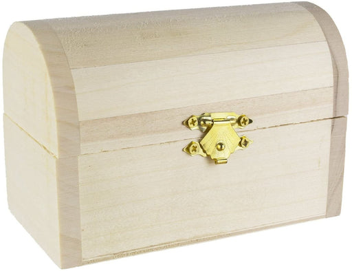 Darice's wood chest measures 4.7 by 2.4 by 3.1 inches in size. The chest includes hinges and a metal clasp. There chest has a curved top to give it...